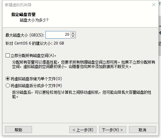 磁盘大小大于或者等于20,将虚拟磁盘存储为单个文件,点击下一步
