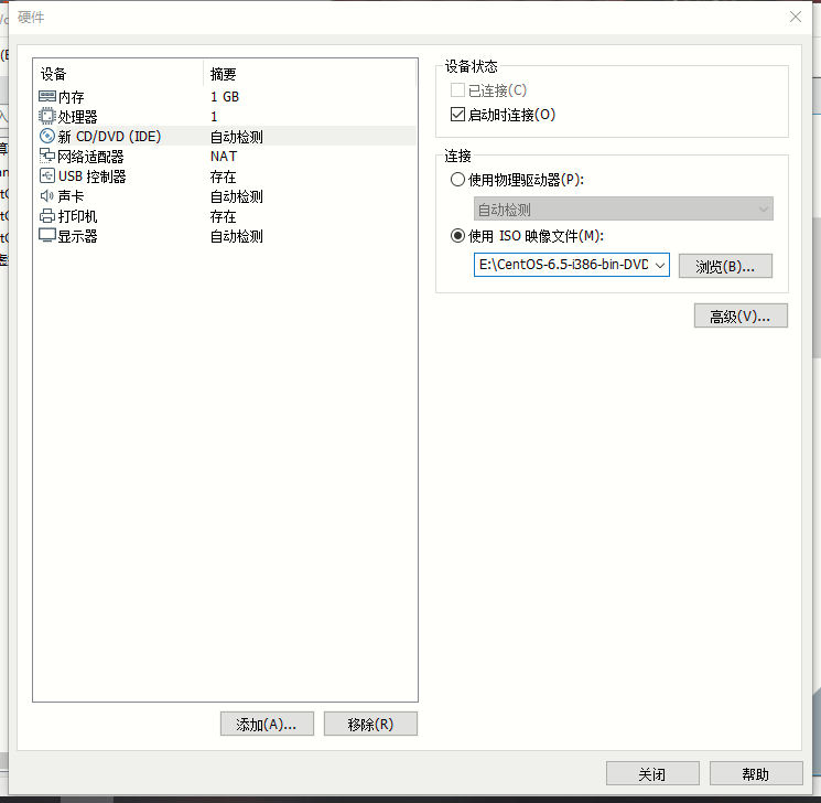 点击硬件设备,点击新CD/DVD(IDE)使用ISO映像文件,浏览你事先准备好的系统,点击关闭