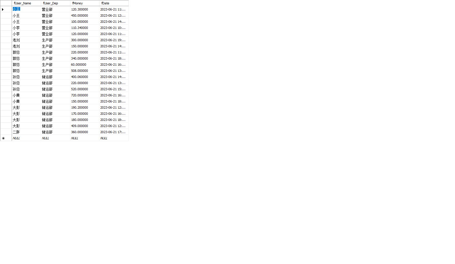 values('小王','营业部',120.3,'2023/06/21 11:00:00')