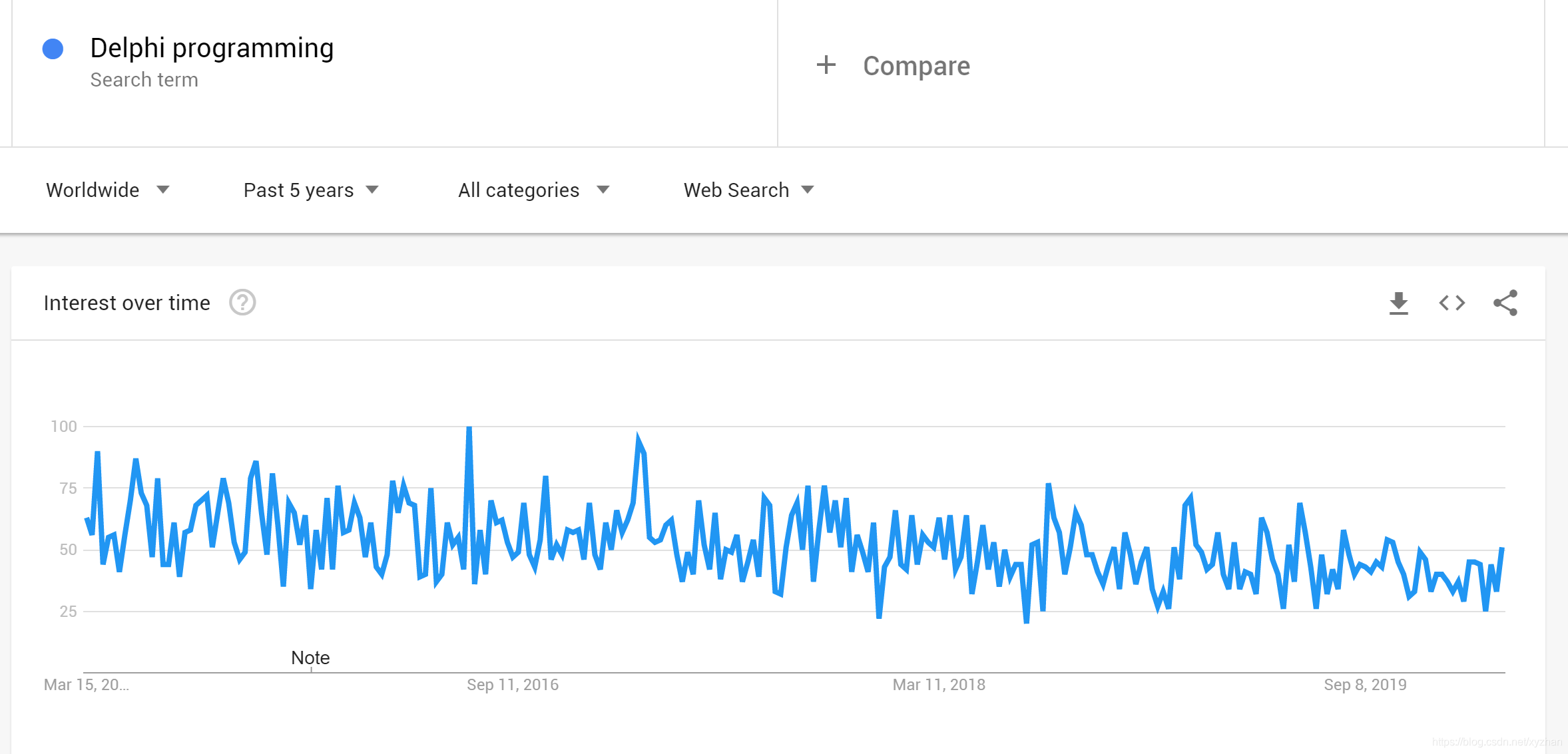 以Google趋势为例,该程序跟踪对一种编程语言的搜索,并在逻辑上分别搜索对该语言和相同名称的其他使用(例如,在希腊的城市,Delphi而言)。以我的拙见,这似乎是一种衡量人气的更准确的方法。现在,在Google趋势中,Delphi远远落后于当今最常用的编程语言(例如Java或javaScript)-这是没有人争执的事实。但是,近年来搜索量没有下降的趋势并不明显。这是过去五年中搜索词“ Delphi编程”的图表: