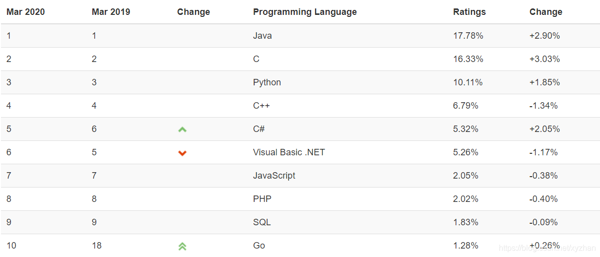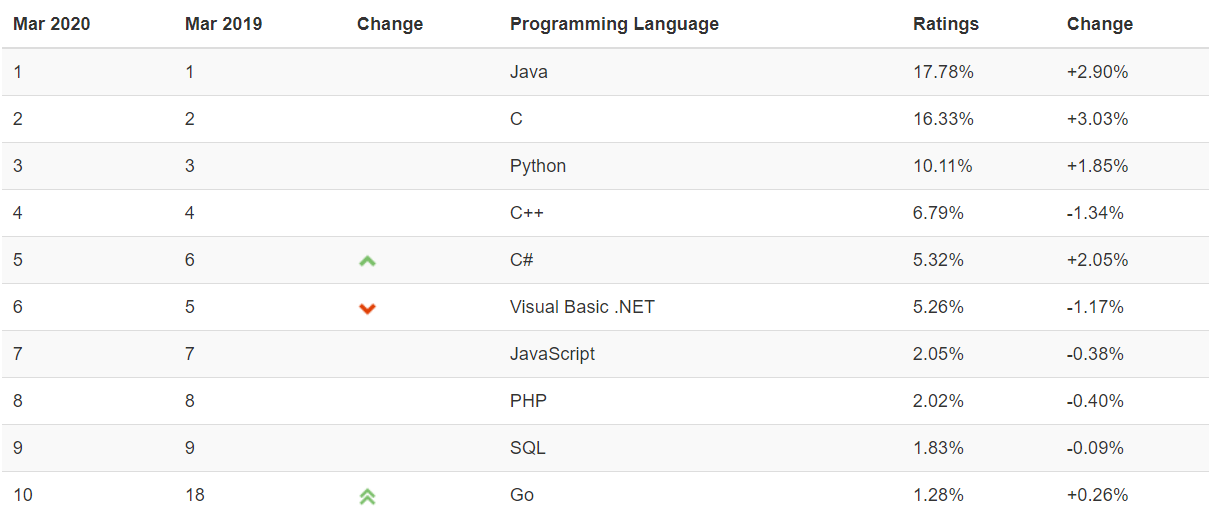 TIOBE于近日公布了 2020 年 3 月的编程语言排行榜。榜单显示:Java继续蝉联榜首,C、Python、C++、C#、Visual Basic .NET、JavaScript、PHP、SQL、Go分列前十。