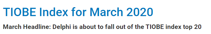 您可能已经看到,最近几天,TIOBE索引网站发布了2020年3月的状态,重点关注Delphi的消亡-自去年以来下降了一个位置-并且其他一些网站也提到了它: