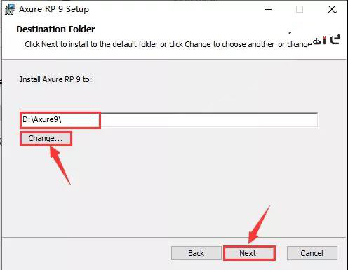 6.点击【Change...】更改软件的安装路径,建议安装在除C盘之外的其它磁盘,可以在D盘或其它磁盘新建一个【Axure9】文件夹,然后点击【Next】。