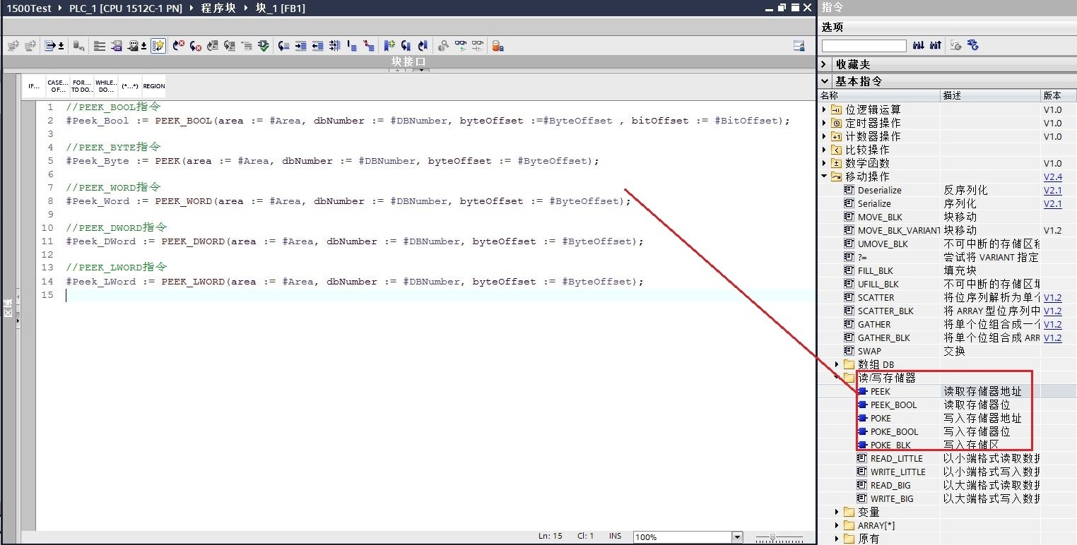 新建SCL程序块FB1,在基本指令->移动操作->读/写存储区内,调用PEEK指令。PEEK指令的语法,如图1所示。