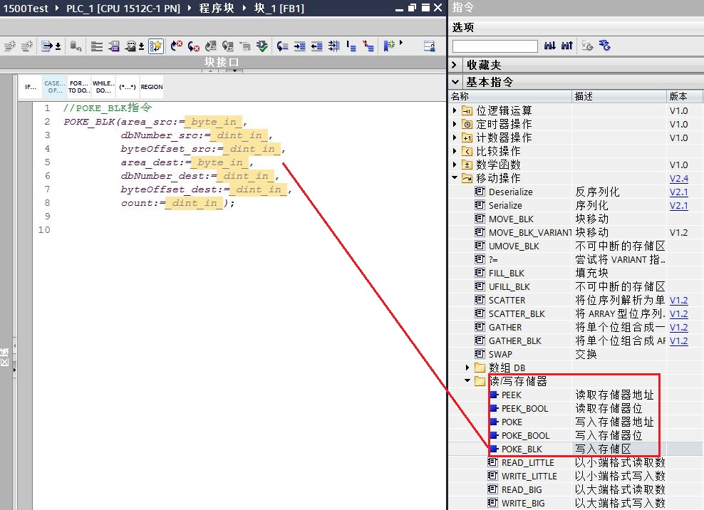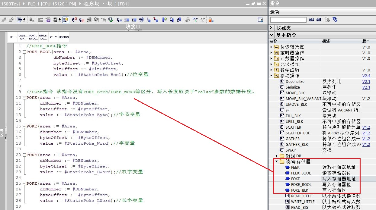 新建SCL程序块FB1,在基本指令->移动操作->读/写存储区内,调用POKE指令。POKE指令的语法,如图4所示。
