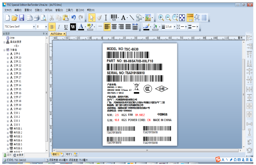 由于打印机内建字中无中文字体,所以 bartender 模板中不能有涉及到中文的变量(例如文字或者条