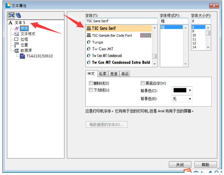2. 注意需要变化的文字或条码,字型需选择为 TSC 开头的字体(此字体无中文,只有数字和英文),