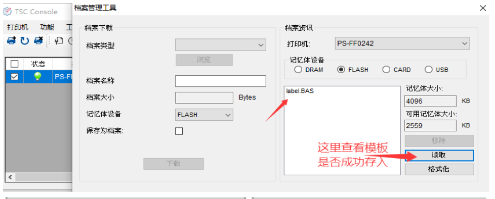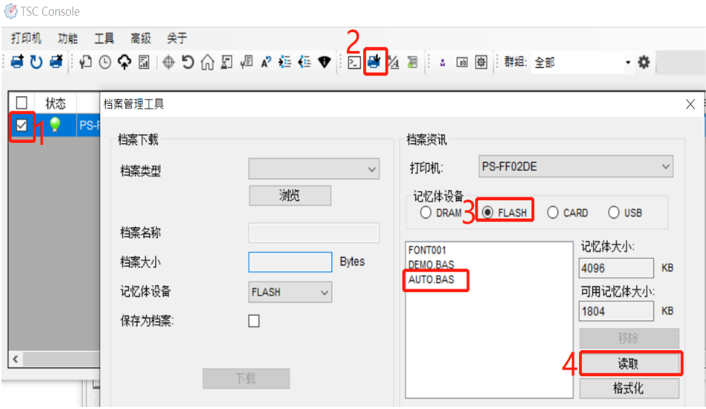 8. 在 TSC Console 中确认,档案管理中包含 AUTO.BAS 文件