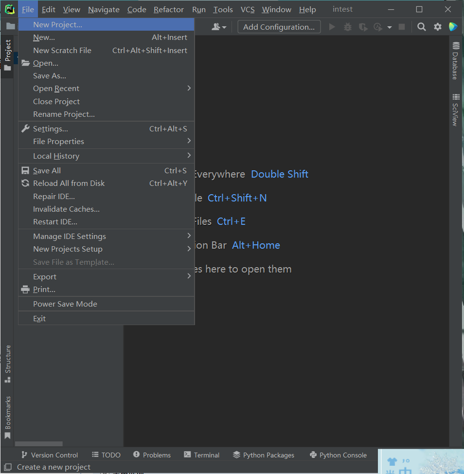 第一步:打开PyCharm,单击“file”,然后选中“New Project...”