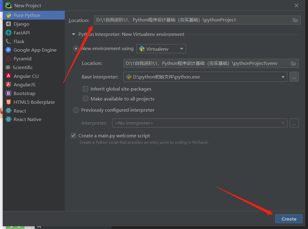 location这里可以选择创建的项目存放的文件夹(这里面的pythonProject是我现在创建的项目的名字),选好后就点“Crate”,
