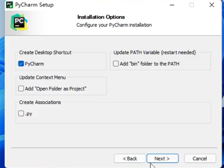 勾选第一个(创建桌面快捷方式),有些教程也会勾选.py的那个,我没有勾选它,然后点击“Next”