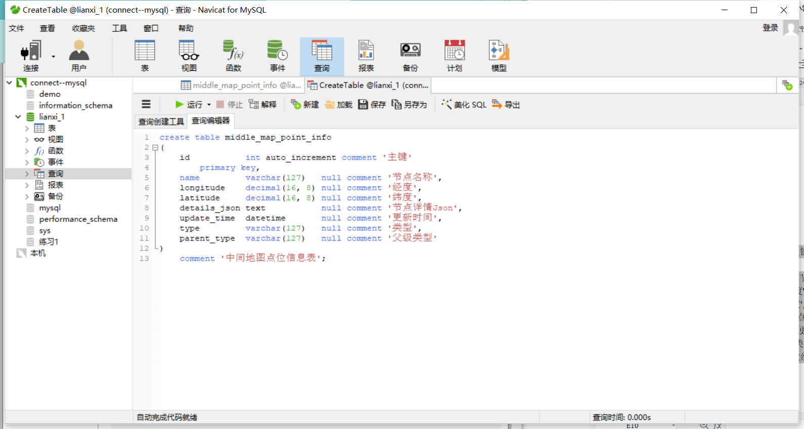 (一)、打开MySQL数据库,打开查询--->新建查询--->输入建表语句