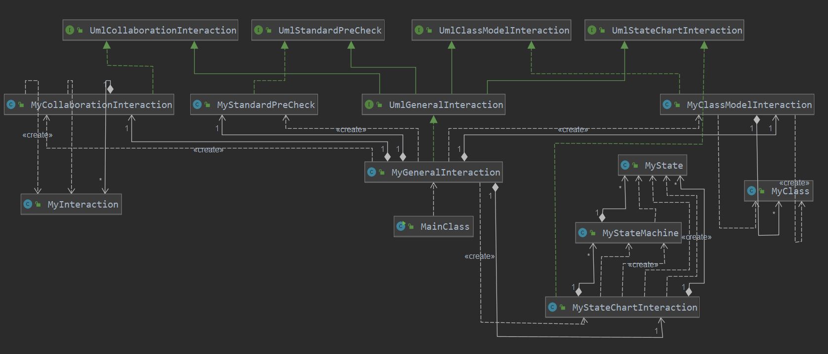 - 在状态图中,我构造了MyStateMachine以及MyState两个数据结构,前者和类图中的MyClass相似,用来储存并管理该状态机下的各种状态以及状态迁移,而后者的创建则是为了将UmlState、UmlFinalState和UmlPseudoState都抽象为MyState,进而方便状态机进行管理。