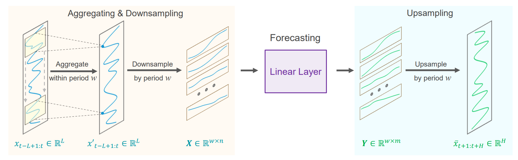 1.将原始时间序列按固定周期w进行下采样,生成w个等长子序列(子序列长度为(长度L/周期w)),然后在这些子序列上进行预测,最后再把预测结果组合回完整的预测序列。