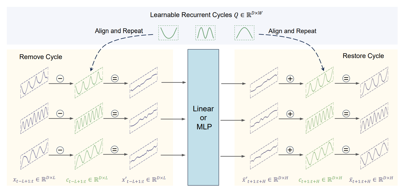 提出了残差周期预测技术,首先通过可学习循环周期显式建模时间序列数据中的固有周期模式,然后对已建模周期的残差分量进行预测。把残差周期预测技术和单层的Linear或双层的MLP结合,就得到了CycleNet。