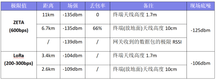 2.覆盖距离:ZETA AM-FSK的0丢包极限覆盖距离为11km(1.7米高度),该点RSSI为-135dbm。测试中存在严重衰减的位置,网关接收的极限场强为-139dbm。Lora相应的结果为3.4km(1.7米高度),-104dbm;极限接收场强-109dbm,2.6km(地面)。