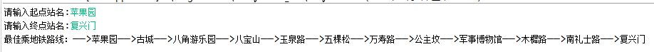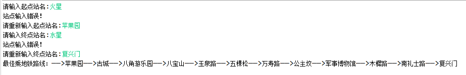 Scanner scanf=new Scanner(System.in); System.out.print("请输入起点站名:"); start = scanf.nextLine(); while (!e.exist(name, start, n)) { System.out.println("站点输入错误!"); System.out.print("请重新输入起点站名:"); start = scanf.nextLine(); } System.out.print("请输入终点站名:"); dest = scanf.nextLine(); while (!e.exist(name, dest, n)) { System.out.println("站点输入错误!"); System.out.print("请重新输入终点站名:"); dest = scanf.nextLine(); } if(e.exist(name,dest,n)) { method f=new method(); float distan=(float)f.Dijkstra(Ma,pa,n,f.exam(nam,start,n), f.exam(nam,dest,n));//调用迪杰斯特拉算法查出此结点到其他点最短路径 int s, d; //调用方法检测 s=f.exam(nam,start,n); d=f.exam(nam,dest,n); System.out.print("最佳乘地铁路线:"); //调用方法输出 f.print(pa,nam,s,d); System.out.print("——>"+dest); }