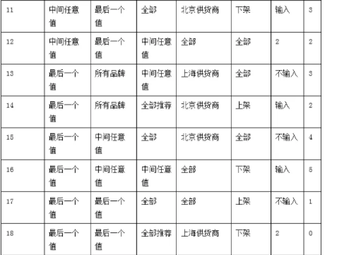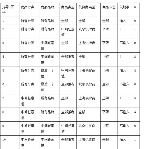 上图所示的查询功能包括所有分类、品牌、商品类型、供货商类型、商品状态及关键字共计6个查询条件,其中“商品分类”、“商品品牌”、“商品类型”包含了若干个分类,“供货商类型”、“商品状态”分别有3种取值,而“关键字”如果以等价类的思想划分,则可分为输入关键字和不输入关键字两种。通过这样的分析,测试工程师可将“商品分类”、“商品品牌”、“商品类型”三种条件采用等价类与边界值思想,各取三个值得,分别是所有、中间任意值,最后一个值,“供货商类型”、“商品状态”分别有3种取值,“关键字”取输入和不输入两个值,如下表所示。