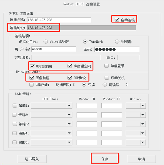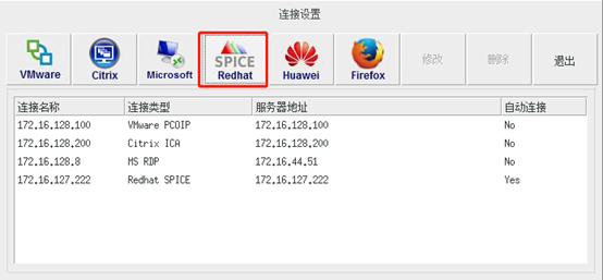 在“Redhat SPICE连接设置”界面中输入连接名;“连接地址”为云桌面系统地址;