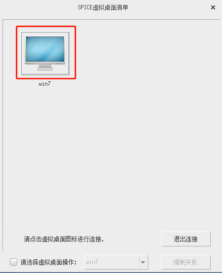 “SPICE虚拟桌面清单”界面中点击虚拟机图标连接到虚拟机中;