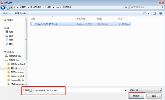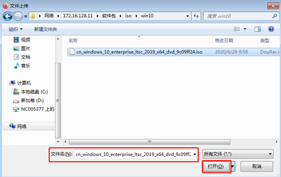 点击“浏览”后出现文件上传窗口,在文件上传窗口中选择要上传的iso镜像,再点击“打开”;