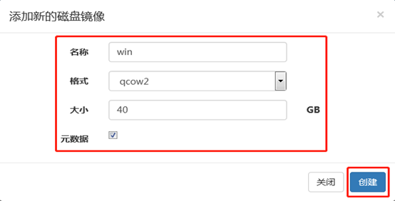 在“添加新的磁盘镜像”窗口中自定义输入名称跟大小;“格式”默认“qcow2”;勾选“元数据”,再点击“创建”;
