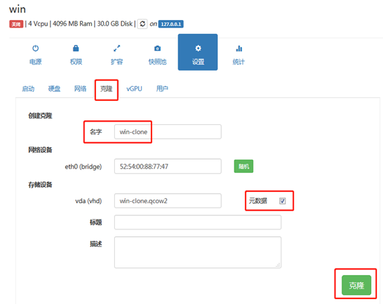 关机完成后点击“设置”,点击“克隆”;开始创建克隆,“名称”自定义修改,勾选“元数据”,设置完成后点击“克隆”;下图所示: