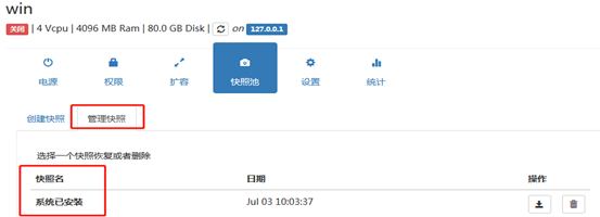 在“管理快照”中选择要恢复的快照,在“操作”中点击“恢复到此快照”;
