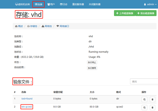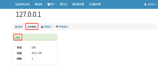 在“127.0.0.1”主机界面中点击“存储池”,再点击“vhd”;