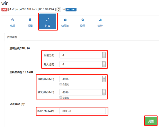 在虚拟机控制界面点击“扩容”,在“资源调整”中自定义调整,只修改“当前分配”跟“最大分配”的大小;修改完成后再点击“调整”;下图所示: