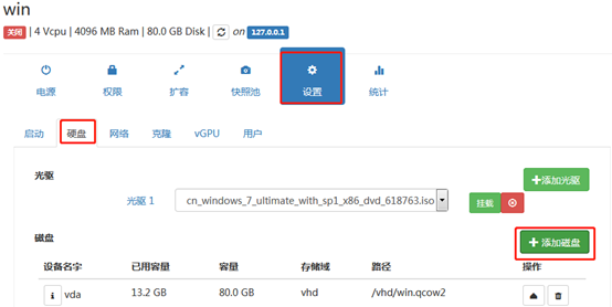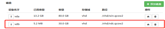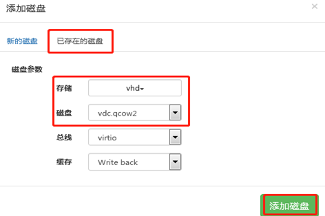 “存储”选择“vhd”;“磁盘”选存储池vhd存在的磁盘;“缓存”选择“Write back”,设置完成后点击“添加磁盘”;