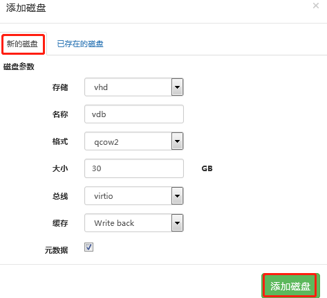 勾选“元数据”;其它参数默认即可;设置完成后点击“添加磁盘”;