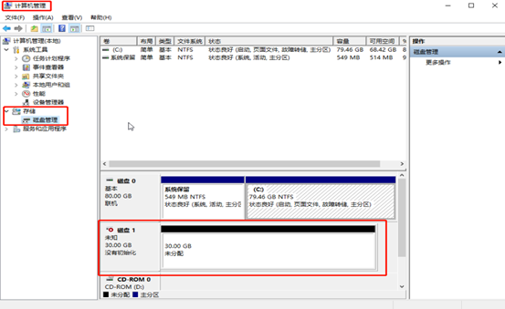 再开启虚拟机在虚拟机系统中打开“计算机管理”,点击“磁盘管理”;显示出已添加的虚拟磁盘;