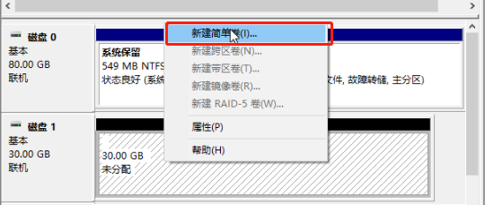 初始化后再右键点击磁盘,点击“新建简单卷”;