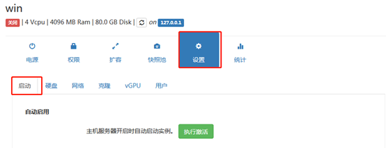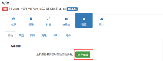 在“自动启用”中点击“执行激活”将执行虚拟机的自动启动;
