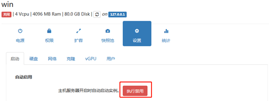 当要取消虚拟机的自动启动,点击“执行禁用”;