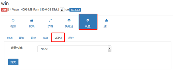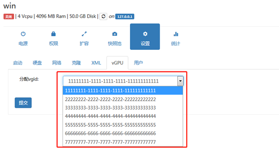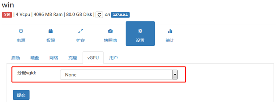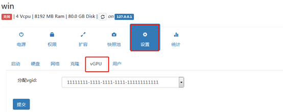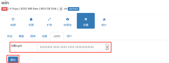 在“分配vgid”栏中选中虚拟显卡,再点击“提交”;