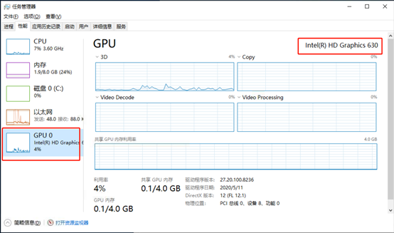 打开“任务管理器”,在性能中显示出“GPU 0”;