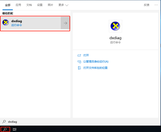 在搜索中输入命令“dxdiag”打开“directX诊断工具”;