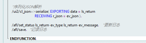 FUNCTION zfm_oa_001. *"---------------------------------------------------------------------- *"*"本地接口: *" IMPORTING *" VALUE(IV_JSON) TYPE STRING *" VALUE(IV_DATA) TYPE ZSMM_OA_001 OPTIONAL *" EXPORTING *" VALUE(EV_JSON) TYPE STRING *"---------------------------------------------------------------------- /afl/log_init. DATA:ls_data TYPE zsmm_oa_001, ls_return TYPE zsmm_oa_001_ret. CLEAR:ls_data,ls_return. IF iv_data IS NOT INITIAL. /ui2/cl_json=>serialize( EXPORTING data = iv_data RECEIVING r_json = iv_json ). ENDIF. "反序列json解析 /ui2/cl_json=>deserialize( EXPORTING json = iv_json CHANGING data = ls_data ). IF ls_data IS NOT INITIAL. "校验 PERFORM frm_check_data_001 CHANGING ls_data ls_return. IF ls_return-ev_type EQ ''. "创建 PERFORM frm_create_data_001 USING ls_data CHANGING ls_return. ENDIF. ELSE. ls_return-ev_type = 'E'. ls_return-ev_message = '数据为空/解析错误'. ENDIF. "序列化JSON解析 /ui2/cl_json=>serialize( EXPORTING data = ls_return RECEIVING r_json = ev_json ). /afl/set_status ls_return-ev_type ls_return-ev_message. "更新日志 /afl/save. "记录日志 ENDFUNCTION.