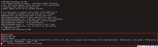 $template cacti_syslog,"INSERT INTO syslog_incoming(facility, priority, date, time, host, message) values (%syslogfacility%, %syslogpriority%, '%timereported:::date-mysql%', '%timereported:::date-mysql%', '%HOSTNAME%', '%msg%')", SQL