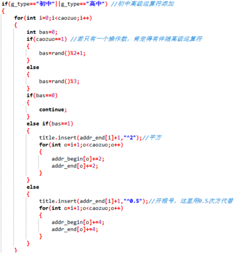 对方在出题的过程中考虑到了一个操作数的情况,如小学题不能出现一个操作数,初中高中题如果是一个操作数必须有高级运算符,而我直接舍弃了一个操作数的情况,从这一点上看,对方在操作数问题上考虑的比我更加全面。对方的部分代码如下: