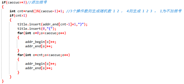 2.对括号的处理考虑不周,对方代码中只可能添加一个括号,而且其左括号被固定在第一个位置,这样会让一些题目无法生成,下为对方对括号的处理: