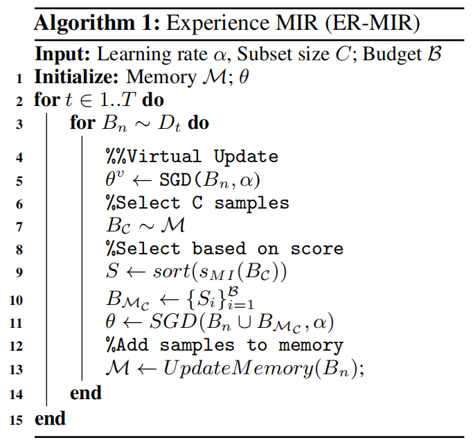 我们首先在经验重放(ER)的上下文中实例我们的方法,这是一种最近成功的排练方法,它存储了以前样本的一小部分,并使用它们来增加传入的数据。在这种方法中,learner被分配一个有限大小的内存M,当样本流到达时,通过使用水库采样进行更新。通常,样本是从内存中随机抽取的,并与传入的批处理相连接起来。给定一个标准的目标\(\min_{\theta}{L}\left(f_{\theta}\left(X_{t}\right),Y_{t}\right)\) ,当接收到样本\(X_t\) 时,我们估计输入批次的参数更新为\(\theta^{v}=\theta-\alpha\nabla L\left(f_{\theta}\left(X_{t}\right),Y_{t}\right)\) 我们现在可以使用该准则\(s_{M I-1}(x)=l\left(f_{\theta^v}(x),y\right)-l\left(f_{\theta}(x),y\right)\)搜索前k值\(x∈M\) ,其中\(l\)是样本损失。我们还可以增加内存,以额外存储迄今为止观察到的最佳\(l\left(f_{\theta}(x),y\right)\) 即为\(l\left(f_{\theta^{*}}(x),y\right)\) 。因此,我们可以进行评估\(s_{M I-2}(x)=l\left(f_{\theta v}(x),y\right)-\min\left(l(f_{\theta}(x),y),l(f_{\theta^*}(x),y)\right)\)