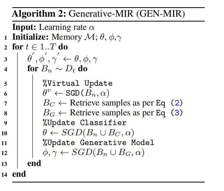 对于分类器,我们也可以根据输入的样本和重放的样本来更新VAE。在等式中1我们只检索在分类器更新条件下会受到干扰的样本,假设是一个良好的特征表示。我们也可以使用相同的策略来减少生成器中的灾难性遗忘,通过检索受干扰最多的估计样本\((φ,γ)\)。在这种情况下,干扰是关于VAE的损失,明显的下界(ELBO)。让我们表示\(γ^v\),\(φ^v\),给定输入批处理的编码器和解码器的虚拟更新。我们考虑以下标准来检索生成器的样本: