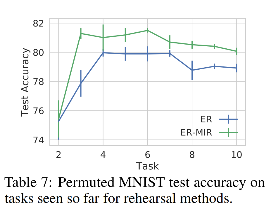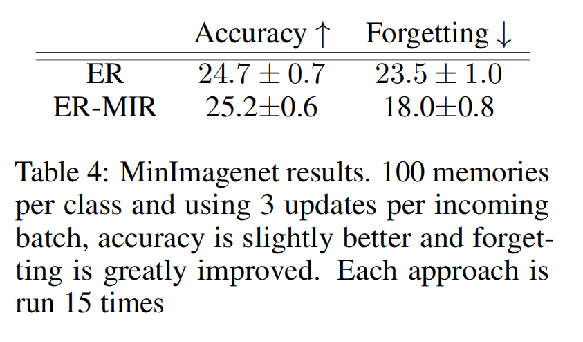 由上表可以观察到加上MIR的方法,精确度上升,遗忘度下降,性能提升。