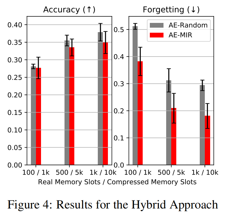 首先注意到,随着压缩样本数量的增加,我们继续看到性能的提高,这表明可以利用自动编码器获得的存储容量。我们接下来观察到,尽管AE-MIR获得了与AE-Random几乎相同的平均精度,但它在遗忘指标上实现了大幅下降,表明在学习任务的表现上有更好的权衡。