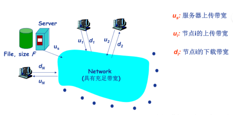 问题 : 从一个服务器向N个节点分发一个文件需要多长时间?下面对比客户机/服务器 和 P2P 文件分发时间。