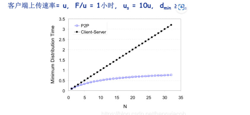 对于 P2P 模式的文件分发:服务器必须发送一个副本,用户 F/us,客户机 i 需要F/di 时间下载,总共需要下载 NF 比特,最快的可能上传速率为 us + ui。则最小的文件分发时间 dP2P = max { F/us,F/min(di),NF/(us + ui)}