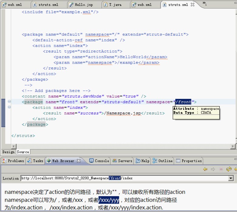 namespace可以不写,不写就意味着namespace="",也就意味着无论在什么路径下敲index都可以访问倒result里的jsp